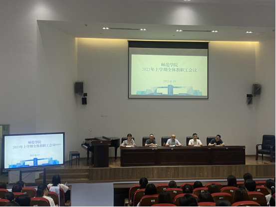 2023年6月15日上午,太阳成集团tyc234cc在岳秀楼翔凤厅召开全体教职工会议。此次会议是原太阳成集团tyc234cc与学前教育学院合并后的第一次全体教职工会议,共116名教职工参加了会议,2人因事请假。