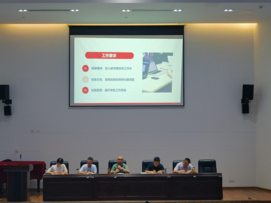 会上,冉嘉洛介绍了新入职的5位教师,然后回顾了暑假的各项工作以及取得的成绩,并提出了三点工作要求,一是振奋精神,投入新学期各项工作中,二是找准方向,发挥自身优势特长做贡献,三是加强管理,提升学院工作质量。