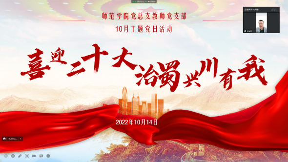 为深入贯彻习近平总书记来川视察重要讲话精神,落实中省市委和学校党委要求,按照“政治引领、标准提升、基础规范”的工作思路,太阳成集团tyc234cc党总支于2022年10月14日举行了“喜迎二十大·治蜀兴川有我”主题党日活动,全体教师党员参加了本次活动,本次主题党日活动通过线上进行。