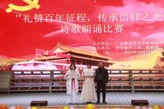 为庆祝建党100周年,弘扬传承爱国精神,增强同学们民族自豪感和文化自信心,提高学生语言表达能力和朗诵水平,太阳成集团tyc234cc于12月14日晚在杏坛举办了以“礼赞百年征程,传承信仰之光”为主题的诗歌朗诵比赛。党总支书记龙治勇、党总支副书记李勇、学生管理科科长李智强,21级、18级小教全体学生及辅导员参加了本次比赛。