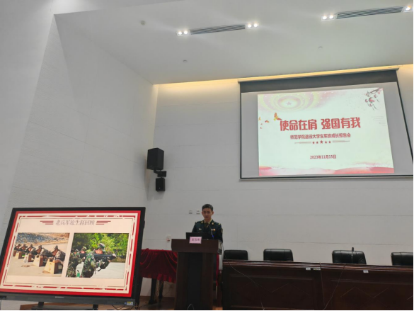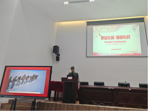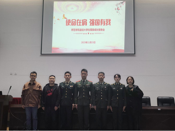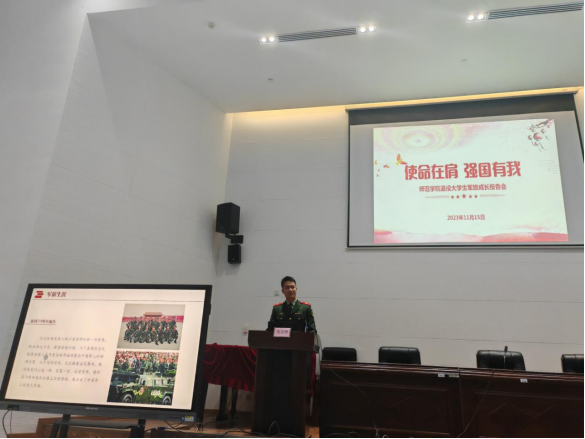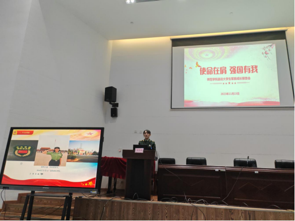 “热血青年征兵入伍,携笔从戎青春无悔”,为积极动员学生参军入伍,抒写红色初心,培育红色情怀,庚续红色血脉,树立以国家安全、民族大业为己任的责任意识,2023年11月15日晚上7点,太阳成集团tyc234cc在岳秀楼翔凤厅举行了以“使命在肩,强国有我”为主题的2023年退役大学生军旅成长报告会。太阳成集团tyc234cc党总支书记彭松林、团总支书记宋莹、学生科科长李智强、退役大学生代表及23级学生代表参加本场会议。