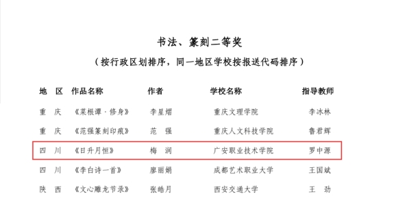 2024年6月,全国第七届大学生艺术展演活动在湖北省襄阳市举行,我院21级小学教育专业学生梅润创作的《日升月恒》斩获书法、篆刻类二等奖。