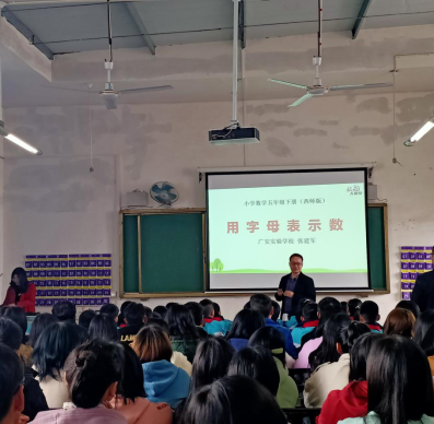 范安容老师示范课课题为人教版五年级语文课《草船借箭》,课堂伊始,安静的教室被小学生们的朗朗读书声所覆盖,范老师引导同学们在诵读中领悟和体会中国古典文学的多姿多彩。随后,范老师从课文主人公引导学生赏析人物形象,在老师的引导与同学们回答的过程中,借箭成功的原因逐渐浮出水面。最后,课堂小结中范老师告诉同学们要像诸葛亮那样专心钻研和学习,用自己的智慧证实自己的成绩。张建军老师示范课课题为西师版五年级数学课《用字母表示数》,课中,张建军老师用回忆字母表的形式导入课堂,由此引出字母可以表示数的课堂主题。课堂上,陈建军老师多次联系生活实际举例、生动形象,讲解条理清晰,重点突出,让小朋友们在轻松活跃的课堂气氛之中学到了知识。