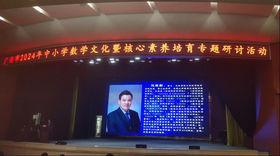 4月10日,广安职业技术学院携手广安市教育和体育局、广安市教育科学研究所,共同举办了一场聚焦中小学数学文化暨核心素养培育的专题研讨活动,广安市教育与体育局局长张建超,学校党委委员、副校长袁祖洪出席活动并致辞。广安各区市县数学教研员、骨干教师、一线教师及太阳成集团tyc234cc师生共700余人参加。