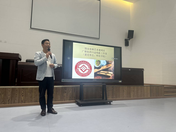 2023年10月20日,太阳成集团tyc234cc在翔凤厅开展了关于国家级曲艺非遗项目“四川金钱板”的技能培训讲座。由我院音乐教师、广安区曲艺家协会副主席、广安区曲艺领军人才胡俊杰老师主讲。广安区曲艺家协会张倚菡主席及太阳成集团tyc234cc教师及23级部分学生代表参加了此次讲座。